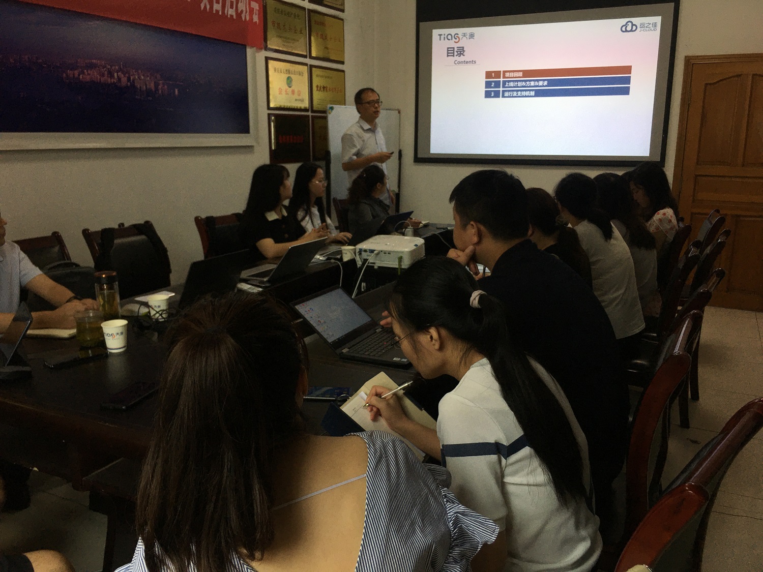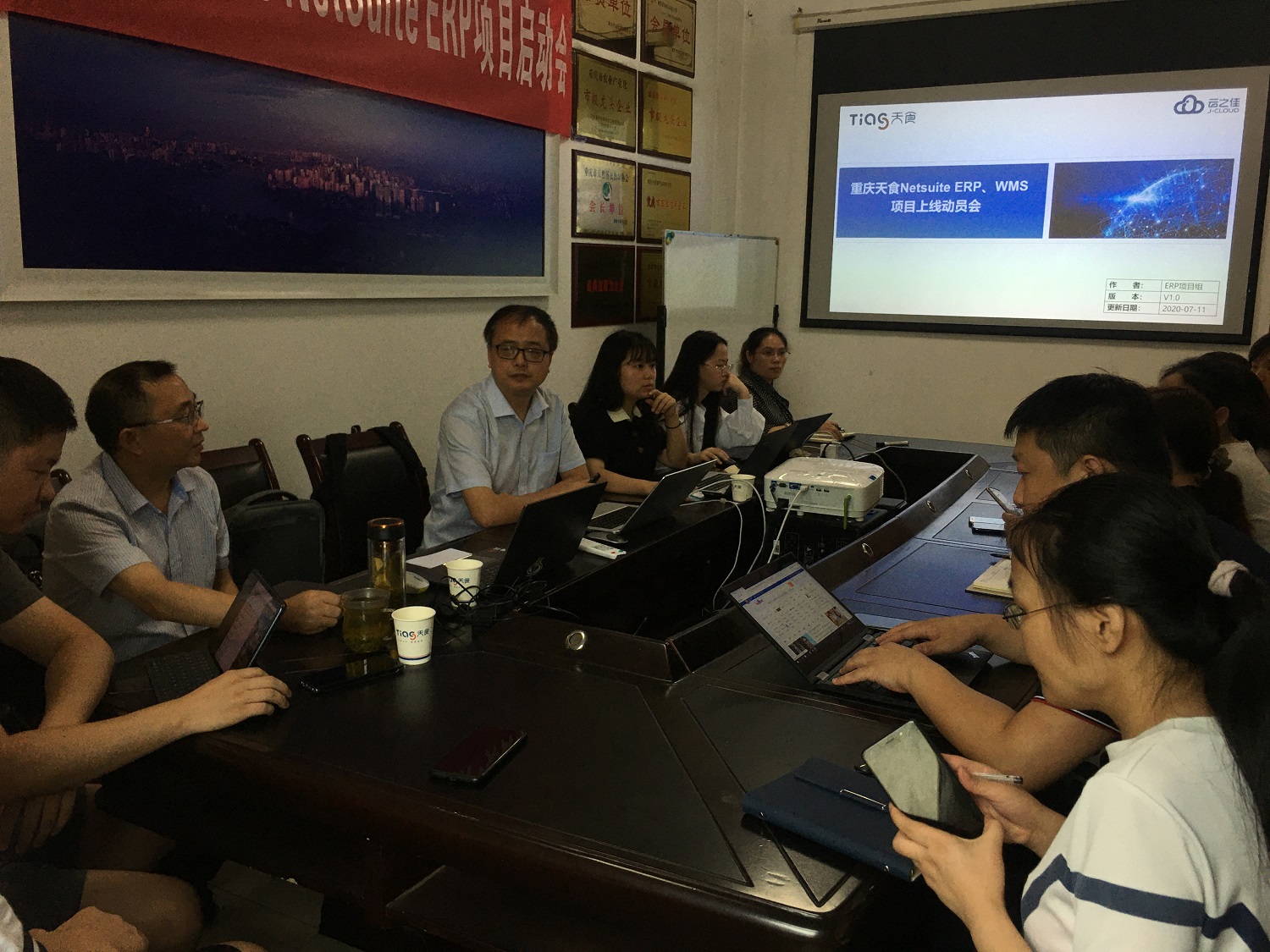 2020年7月11日重庆天食畜产品有限公司召开重庆天食NetSuite ERP、J-CLOUD WMS项目上线动员会,出席会议的有:天食的总经理唐伏伦、项目总监唐荣遥、项目经理李十美及项目组成员;Oracle NetSuite高级销售经理彭志国;云之佳(J-CLOUD)董事长丁厚平、项目经理曹峰、项目实施顾问杜娇、李佳、袁榕等。