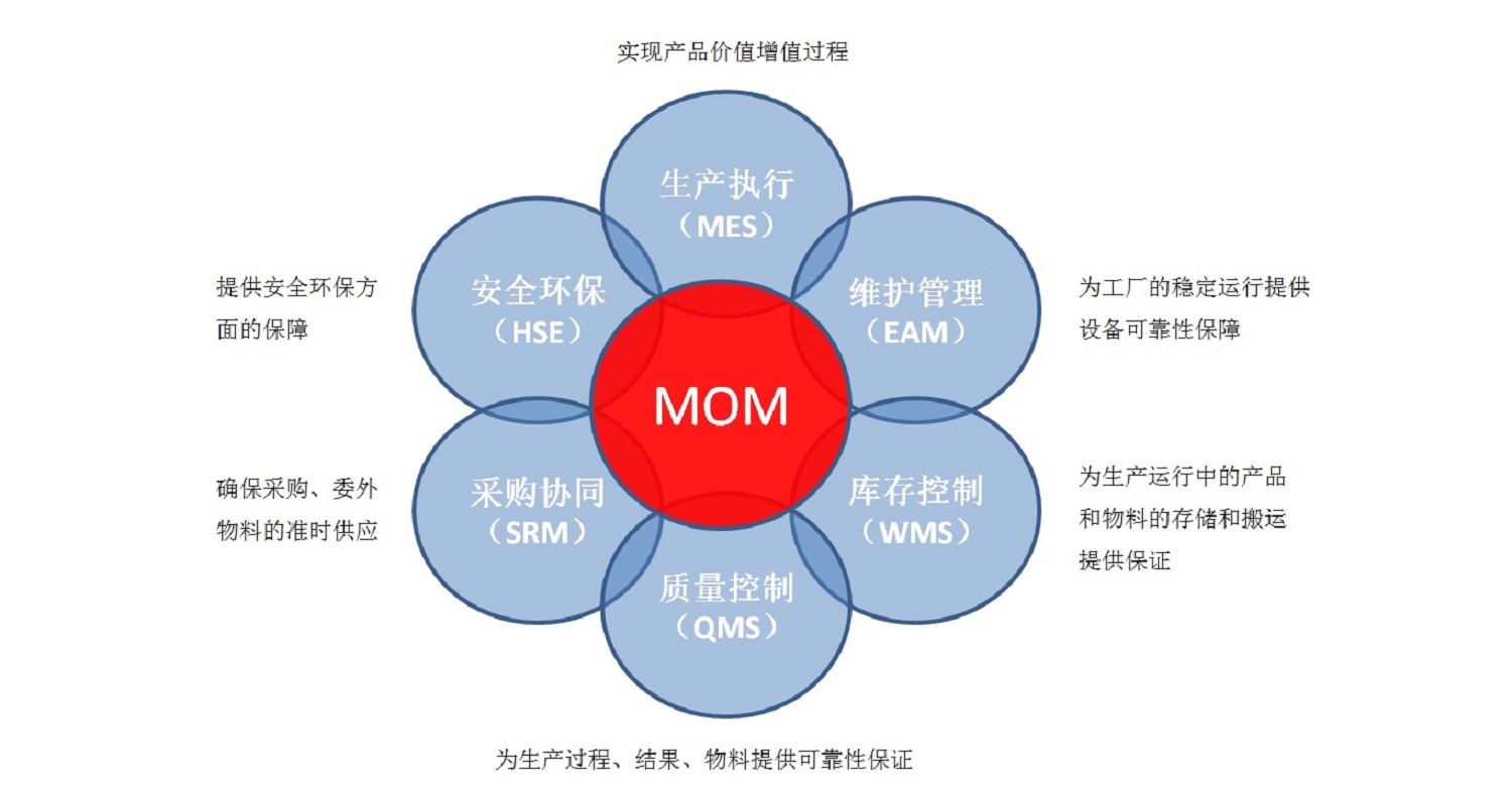 ISA-95最早提出了MOM(Manufacturing Operations Management)概念,并定义为:“通过协调管理企业的人员、设备、物料、能源等资源,把原材料或零件转化为产品的活动”。MOM的范围主要包含了四大部分,分别是生产执行、质量控制、维护管理和库存控制。