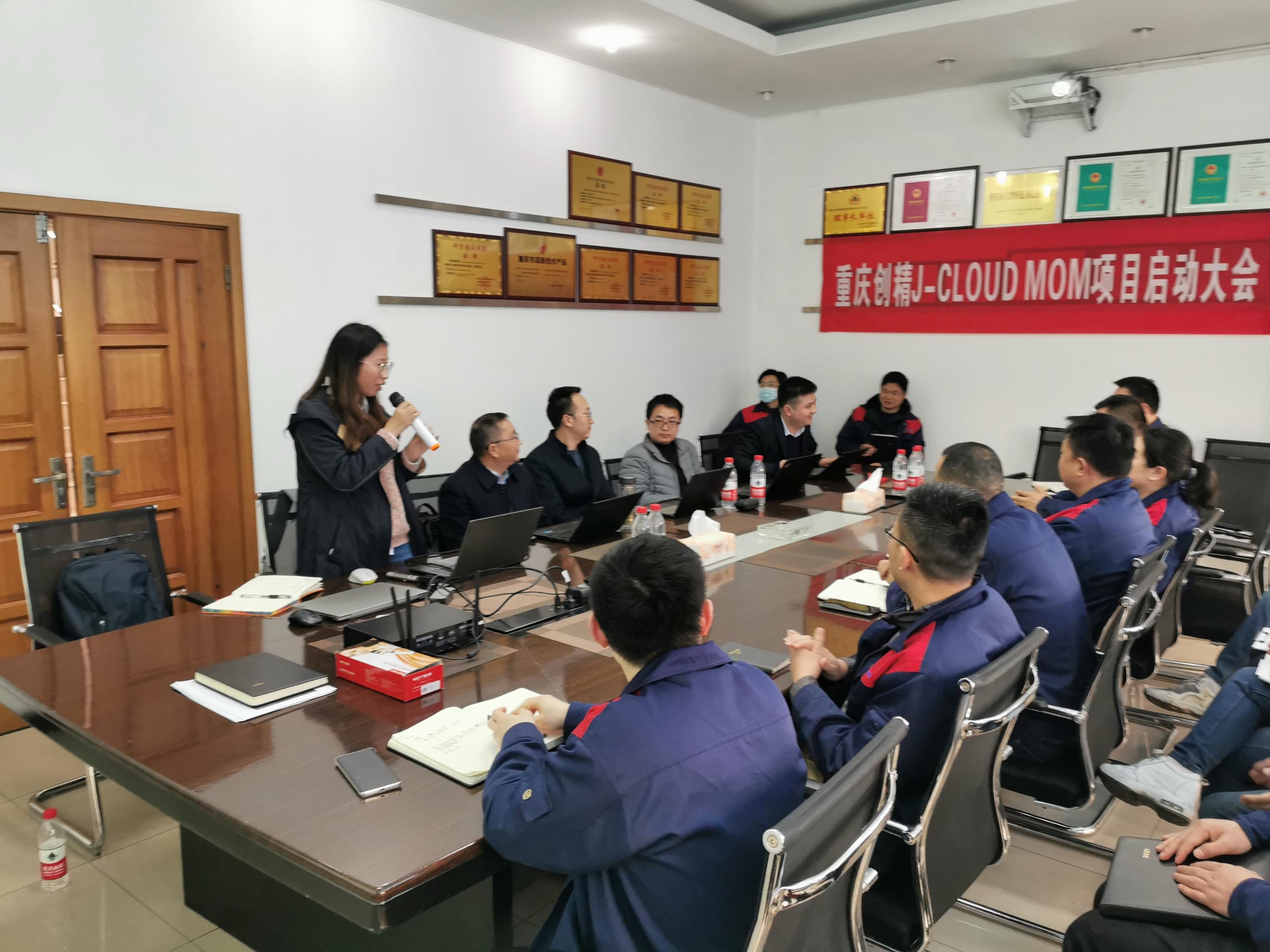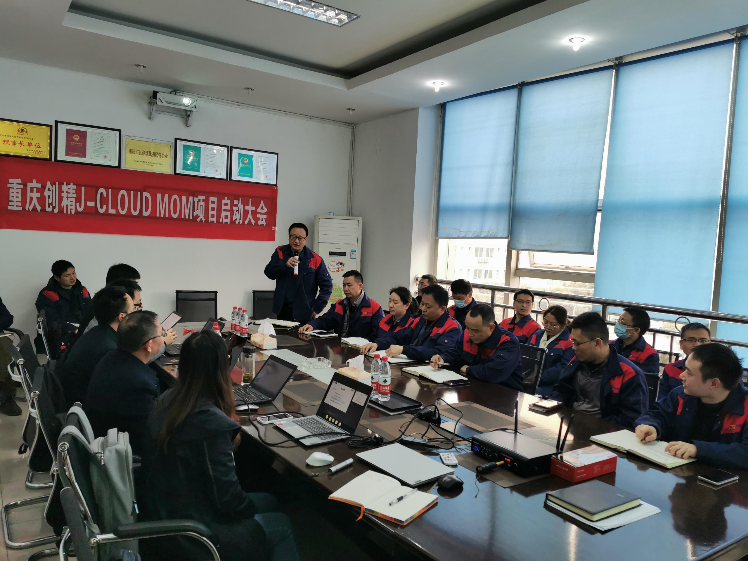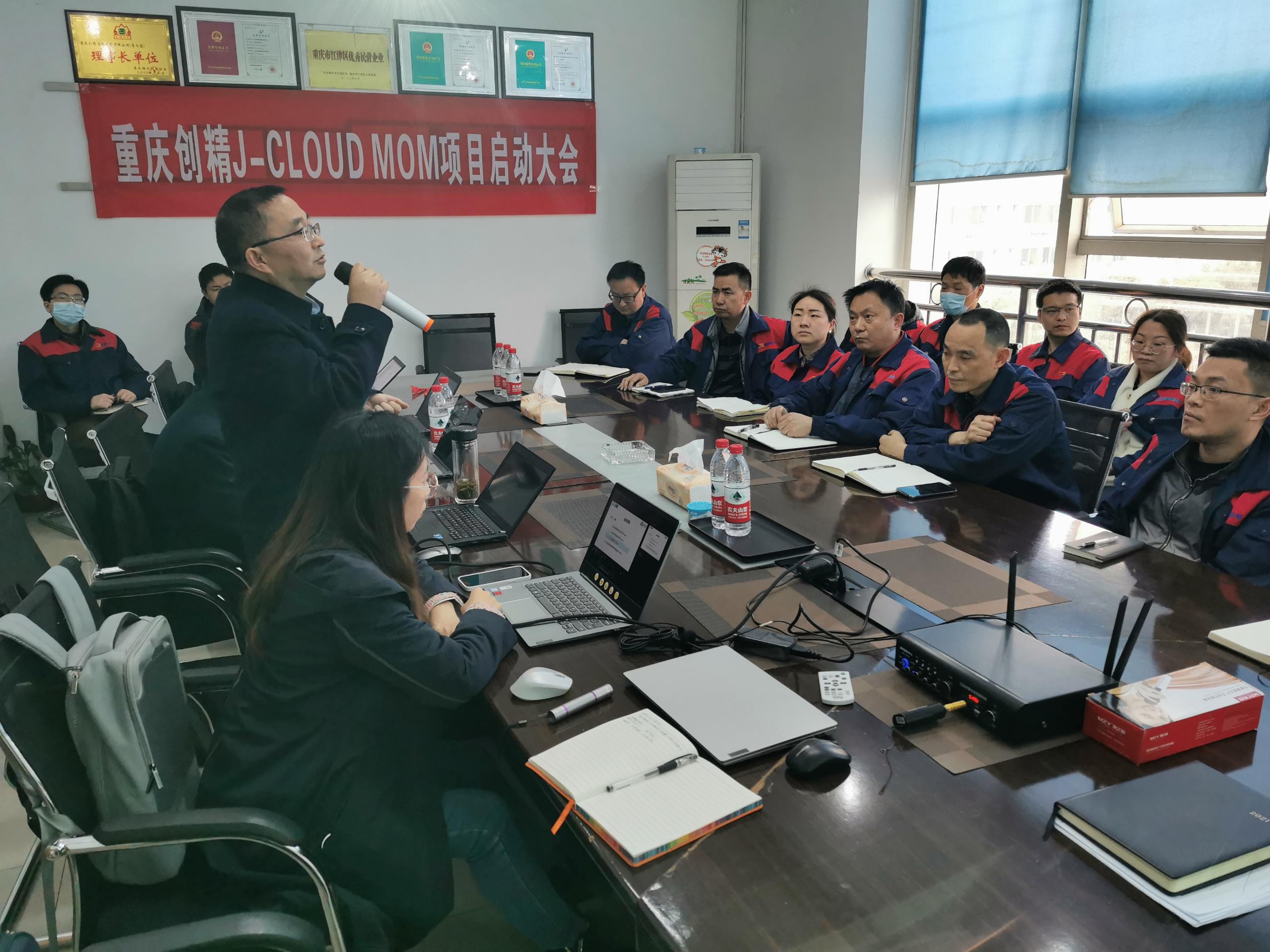 重庆创精J-CLOUD MOM项目启动大会于2021年3月4日正式召开,出席本次大会的有:重庆创精总经理胡斌、总经理助理、IT总监胡易及重庆创精的高管团队、中层团队和项目组人员,重庆云之佳科技股份有限公司(J-CLOUD)董事长丁厚平、总经理张宇杰、MS事业部总监卞小松、销售经理伍源正、项目经理杜娇、项目副经理周进等。