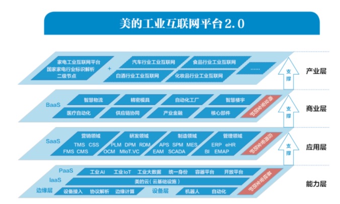 2020年11月,美的又发布了美的工业互联网2.0。通过这次升级,美的工业互联网的能力层更加清晰、更加丰富,形成了“四横八纵”的赋能制造业升级转型格局。