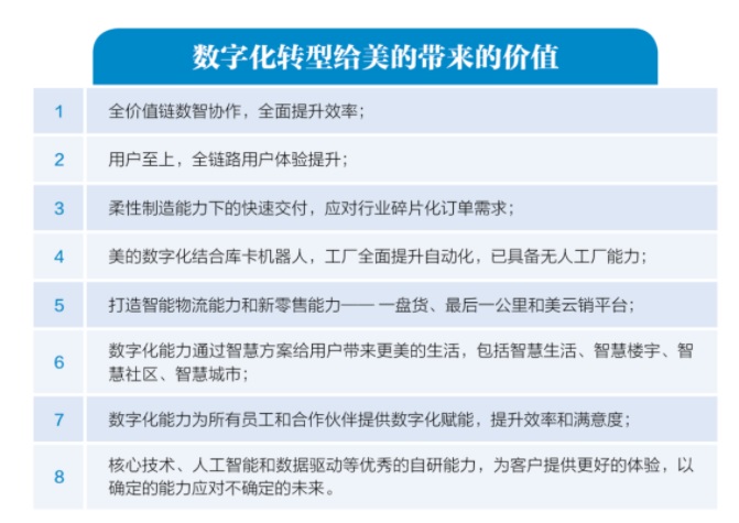 2020年,美的确定了新的数字化转型战略——全面数字化、全面智能化。在内部,通过数字化技术提升企业效率,实现全价值链卓越运营。在外部,通过数字化工具紧紧抓住用户,直达用户。