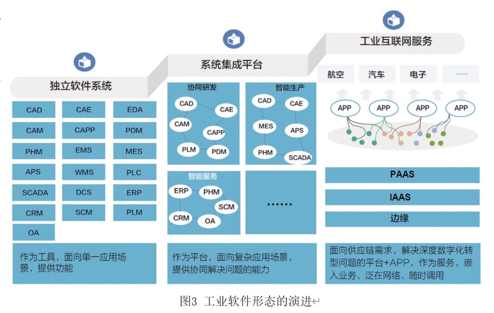 随着工业企业信息化水平不断提升,市场需求的变化对工业生产提出了更高的协同要求。生产过程各环节的信息系统需要进行改进以满足更多的需求,例如协同研发、智能化生产、智能化服务等。此时,面向单一场景的工业软件已经不能满足复杂业务场景需求,不同类型工业软件之间加速融合,各系统通过定制化接口相互集成,一些有实力的工业软件供应商开始整合自身产品线,提供集成化、平台化的整体解决方案。例如西门子在2019年将自己的工业软件命名为“数字工业软件平台(DISW)”,达索系统也推出了3D EXPERIENCE平台。