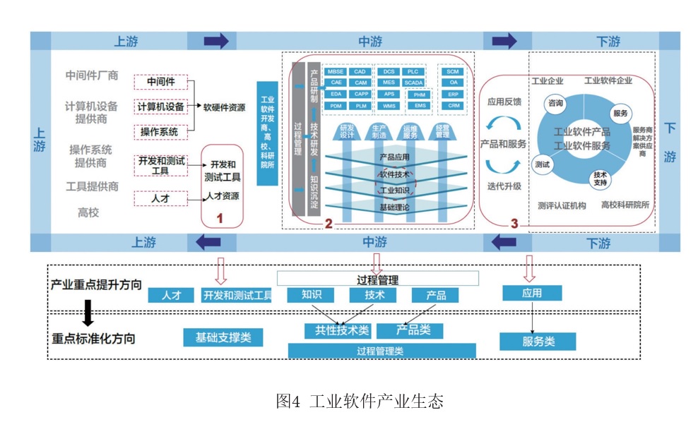 工业软件产业按照价值链可划分为上中下三段,其中上游部分是工业软件发展的基础,包括人才知识储备和软、硬件技术基础两方面;中游部分主要是工业软件产品和服务的研发,利用上游提供的基础资源面向下游需求开发工业软件产品和服务;下游部分是工业软件的应用和服务市场。上中下游可看作一个小型生态,在循环中将下游应用反馈和需求不断向中上游企业反馈,牵引整个工业软件产业生态向前发展。