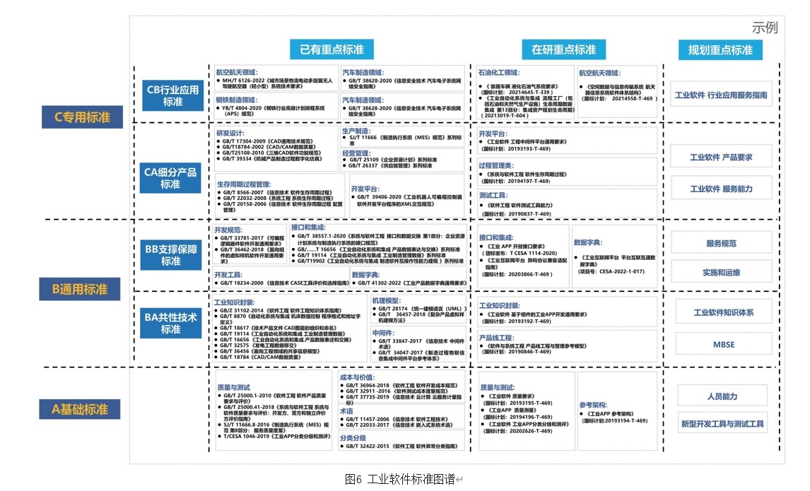 基于上述工业软件体系,按照已有标准、在研标准、规划重点标准梳理工业软件标准图谱,如图6所示。标准图谱展示了各类工业软件标准化现状,包括已有、在研和规划重点的相关标准。