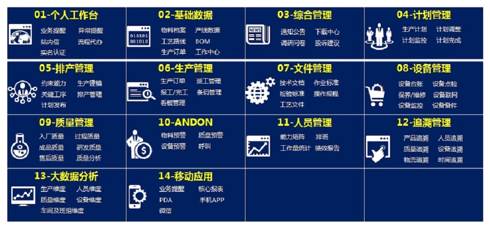 云之佳MES生产管理系统旨在打造支撑计划管理、排产管理、生产管理、工艺文件管理、设备管理、质量管理、安灯管理、人员管理、追溯管理、大数据分析等业务环节进行有效管理和控制的生产执行系统。