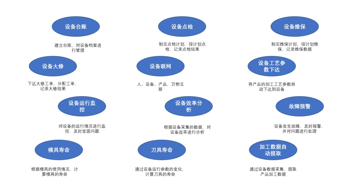 云之佳EAM数字化设备管理系统典型业务场景有:设备台账、设备点检、设备维保、设备大修、设备联网、设备运行监控、设备效率分析、故障预警、模具寿命、刀具寿命、加工数据自动提取、设备工艺参数下达等。