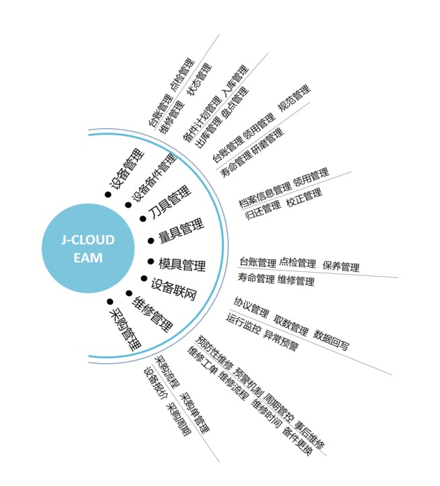 云之佳EAM数字化设备管理系统旨在打造支撑设备档案、设备点检、设备保养、设备维修、设备寿命、设备备件、设备联网、设备效率及大数据分析等业务管控的数字化设备管理系统。