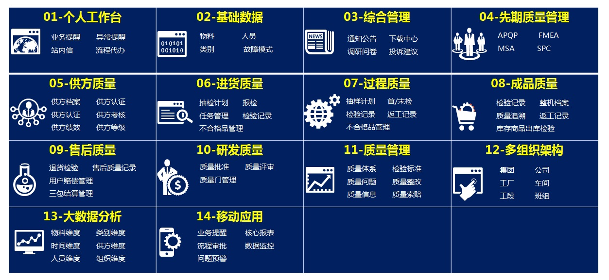 1、云之佳QMS数字化质量管理系统全面覆盖质量活动的所有业务环节,功能模块可以灵活选择,可以满足企业不同发展阶段、不同信息化水平的要求。